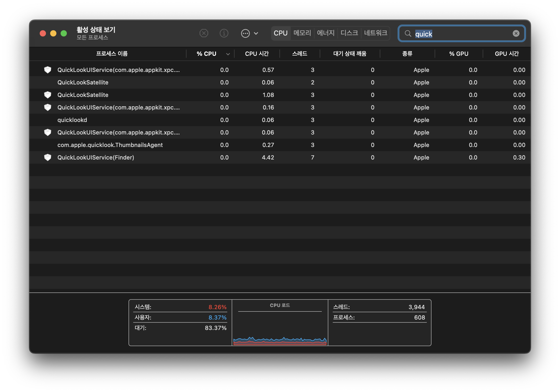 QuickLookUiService(Finder)를 선택하고 상단 바에서 동그라미 x 표시를 누르고 강제종료를 눌러주세요.