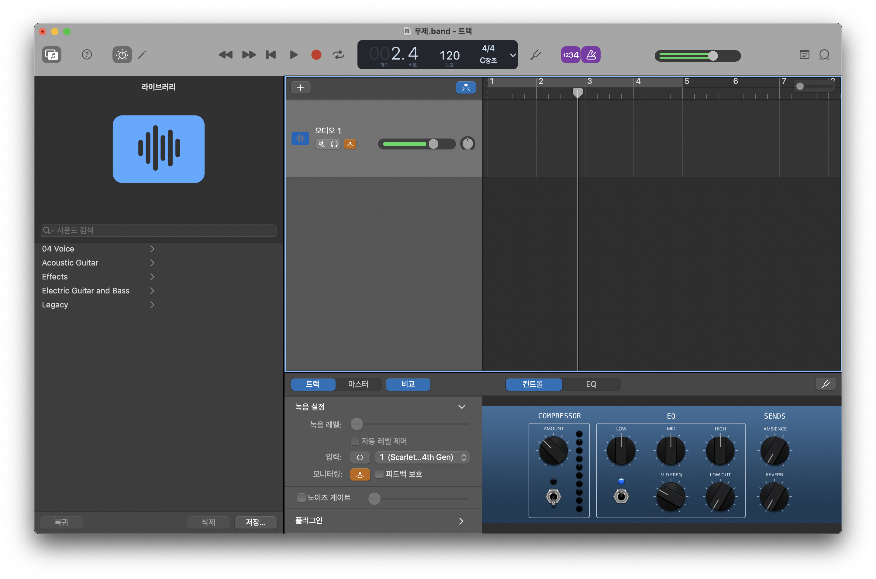 기본 트랙에 입력에 스칼렛 솔로의 1번 인풋을 설정한다.